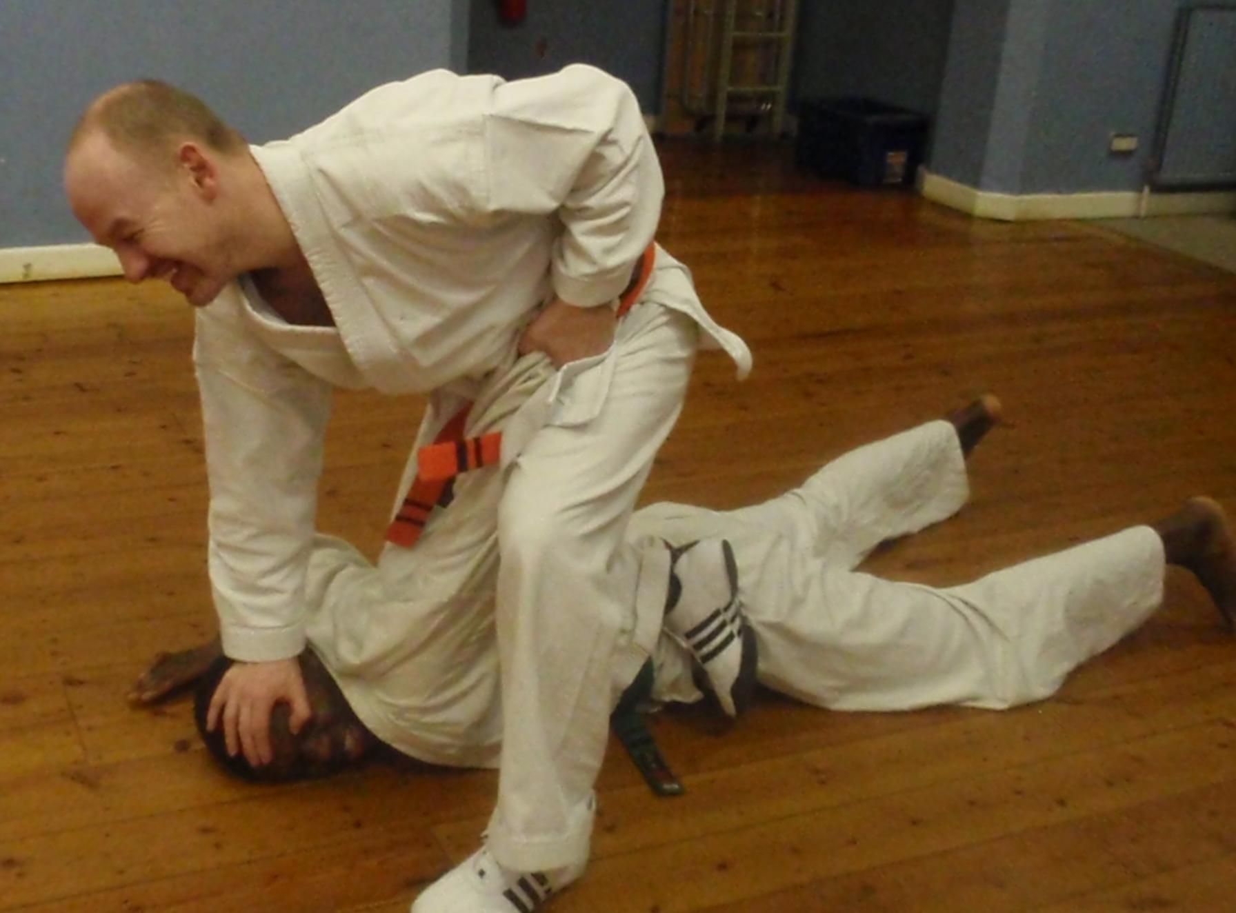 Ideally the only way in which we become involved in groundwork is when we've thrown or knocked an assailant to the ground and can apply a joint-lock in order to 'pin' them (ie. restrain and immobilise) on the ground.